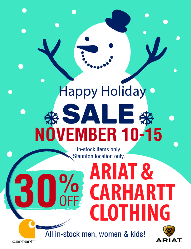 30% Off Ariat & Carhartt Clothing! November 10-15. Staunton location only. In-stock items only.