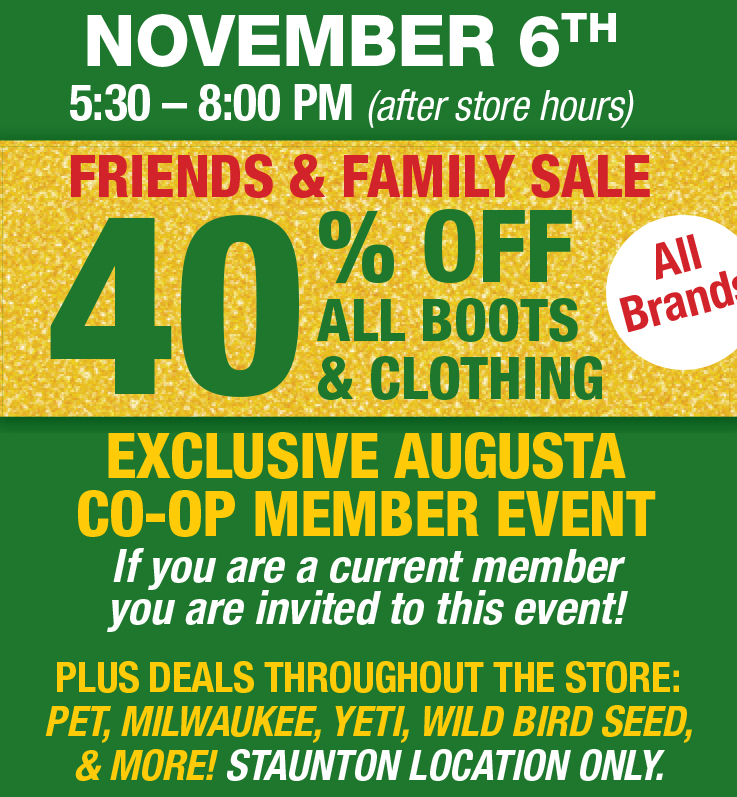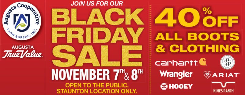 Get 40% off boots and clothing during our Black Friday event! November 7-8. Staunton location only. This event is open to the public.