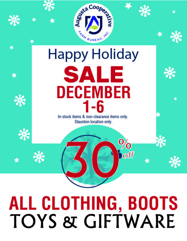 30% off clothing, boots, toys, and giftware! December 1-6. In-stock non-clearance items only. Staunton location only.